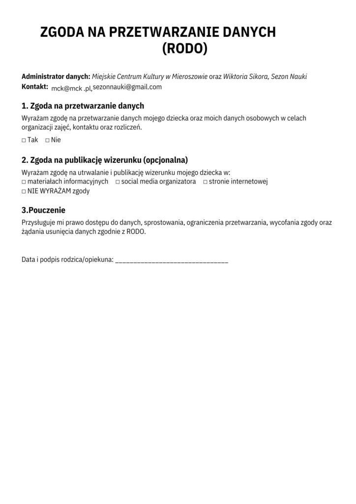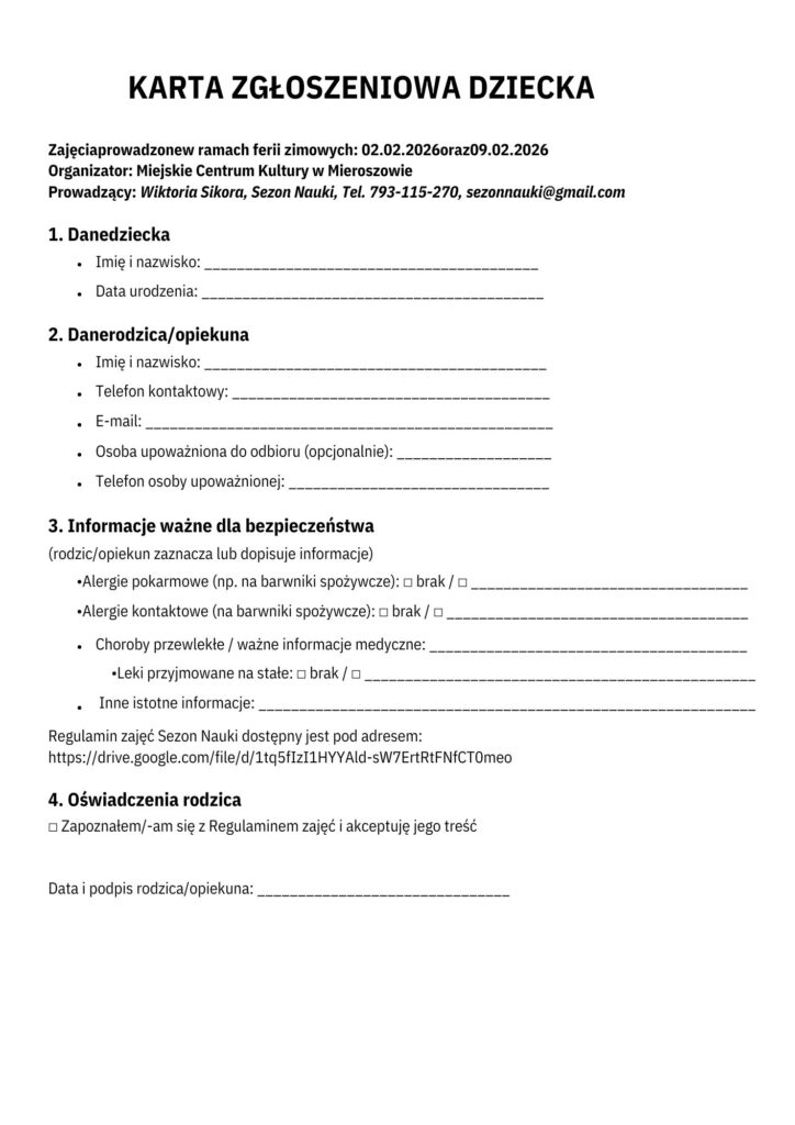 Obowiązują zapisy na zajęcia i konieczne jest podpisane zgłoszenie podpisane przez rodzica lub opiekuna.